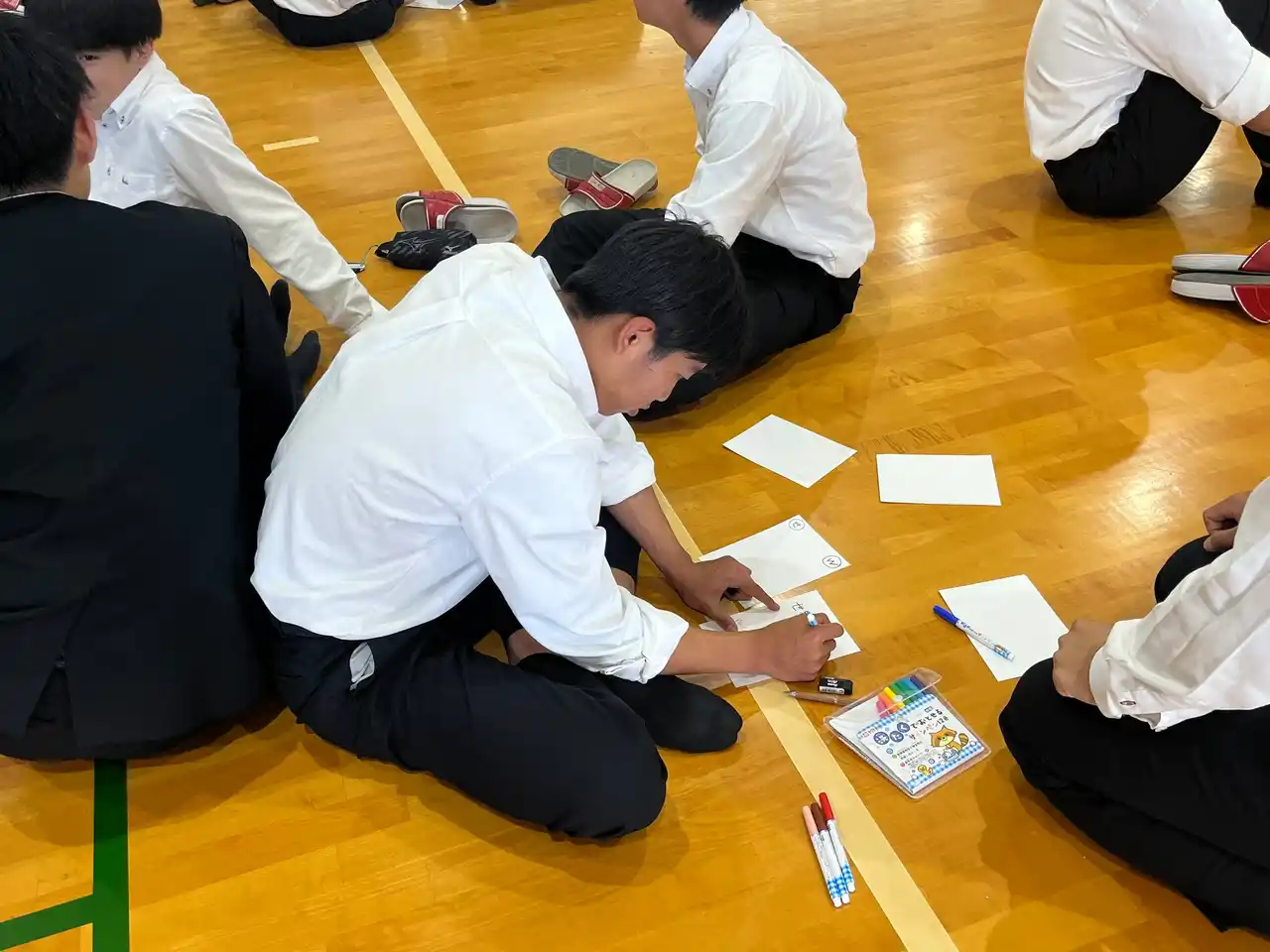 同年11月には全校生徒向け講演会が実施され、サステナ部が世界で起こした平和づくりの実例が紹介されました。この講演会で、中村雄一代表は「君たちにも今できることで世界を平和にしよう」と呼びかけ、高校1年生がそれに応える形で、平和・SDGs・未来への願いを込めたSDGsカルタを制作しました。生徒一人ひとりの言葉、発想、個性を反映したこのカルタは、「受験のための学び」から「誰かの役に立つための学び」へと視点を転換する教育実践として位置づけられました。 |