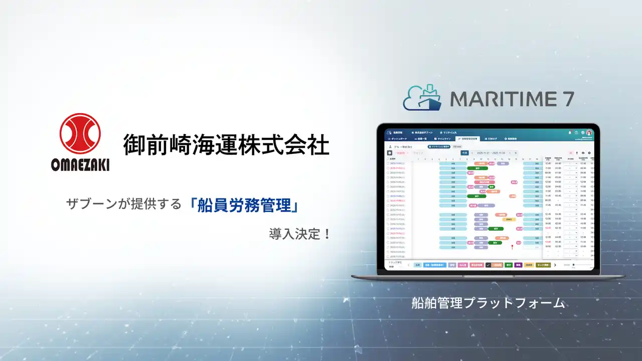| 株式会社ザブーン(本社:東京都港区、代表取締役 戸高克也)は、当社が開発・運営する船舶管理プラットフォーム「MARITIME 7」の一機能である船員労務管理を、御前崎海運株式会社(本社:東京都港区、代表取締役 小池 裕治)に導入したことをお知らせいたします。 | ||||||||||||||||||||||||||||