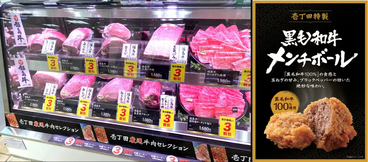 今回のリニューアルでは、対面販売のライブ感はそのままに、さらに精肉専門店の素材で店内手作りした「壱丁田の肉惣菜」を拡大。地産地消の「福島牛」や「福島県産ほろよい豚」のラインナップを拡充し、地域の皆様の食卓に、より新鮮で高品質なお肉と、手軽に楽しめる精肉専門店「肉処 壱丁田」の味をお届けします。 |