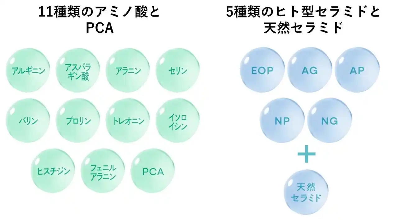 *¹ 当社調べ。(2021/11 - 2025/11累計) *² 当社調べ。効果を保証するものではありません。 *³ アルギニン、アスパラギン酸、グリシン、アラニン、セリン、バリン、プロリン、トレオニン、イソロイシン、ヒスチジン、フェニルアラニン(全て保湿成分) *⁴ PCA、PCA-Na(全て保湿成分) *⁵ セラミドEOP、セラミドNG、セラミドNP、セラミドAG、セラミドAP、グルコシルセラミド(全て保湿成分) *⁶ 角質層のこと *⁷ クオリティファーストとして *⁸ 保湿成分 *⁹