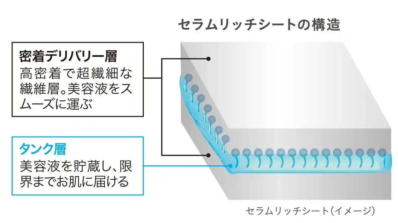 大容量シートマスクでありながら、シートの厚さや柔らかさだけでなく、高い密着性と多くの美容液を抱えられる保液性、そして肌へと成分をリリースするデリバリー力の高さまでとことん追求して設計した「セラムリッチシート」。肌当たりの柔らかい3層構造の高*⁷浸透*¹⁰・高密着*⁷シートは、これまでのシートよりも厚みが110%*⁹に、密着力はなんと137%*⁹にUPしております。さらに、シート1枚あたりの美容液含浸可能量も117%*¹¹にUPし、美容液を保持しながら、スムーズにお肌に運ぶ機能性を誇り、お肌に限界まで美容液を届けます。 |
