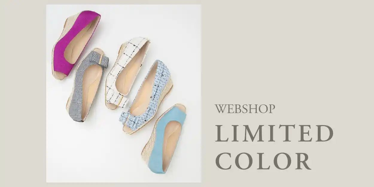 今年はリボン付きで大人可愛い5cm台ウェッジと美脚効果バツグンな7cm台ヒールの2モデルでWEB限定カラーをご用意いたしました。 |