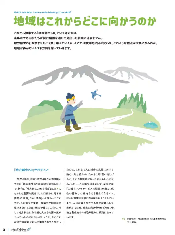 | 本冊子は、地域創生における「正解」や「成功事例」を提示するものではありません。むしろ、これまで半ば自明のものとして語られてきた「地域創生」という言葉や、その背後にある前提・構造に立ち止まり、「地域創生とは何か」「誰のための取組みなのか」を本音で対話するための土台となることを目的としています。 | ||||||||||||||