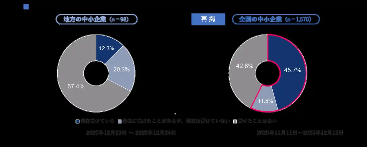 地方の中小企業では外部専門家との接点が全国の中小企業と比較した場合に相対的に少なく、伴走支援の活用が進んでいない状況が示唆されます。加えて、地方では「現在受けている」(12.3%)よりも「過去に受けたことがあるが、現在は受けていない」(20.3%)の割合が高く、伴走支援が継続的な活用に結びついていない状況もうかがえます。 |