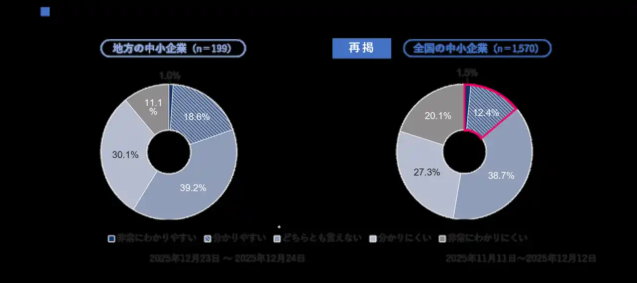 中小企業支援に関する情報(補助金・助成金等)の分かりやすさについて質問を行いました。「地方の中小企業」では、「非常に分かりやすい」と回答した企業はわずか1.0%であり、「分かりやすい」の18.6%と合わせても19.6%にとどまりました。「全国の中小企業」も、「非常に分かりやすい」(1.5%)と、「分かりやすい」(12.4%)を合わせても15%を下回る回答でした。中小企業支援に関する情報の分かりやすさについては地方と全国の間に大きな差は見られず、全国共通の認識といえます。 |
