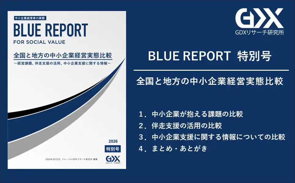 『「新しいあたりまえ」で、新しい世界を創るFORVAL』を理念に掲げる、次世代経営コンサルタント集団である株式会社フォーバル(本社:東京都渋谷区、代表取締役社長:中島 將典、以下「フォーバル」)が運営するフォーバル GDXリサーチ研究所は、中小企業向けの様々な支援に関する認知・理解状況や活用実態などについて調査した「BLUE REPORT 特別号」を2026年3月23日(月)に発行いたします。 |