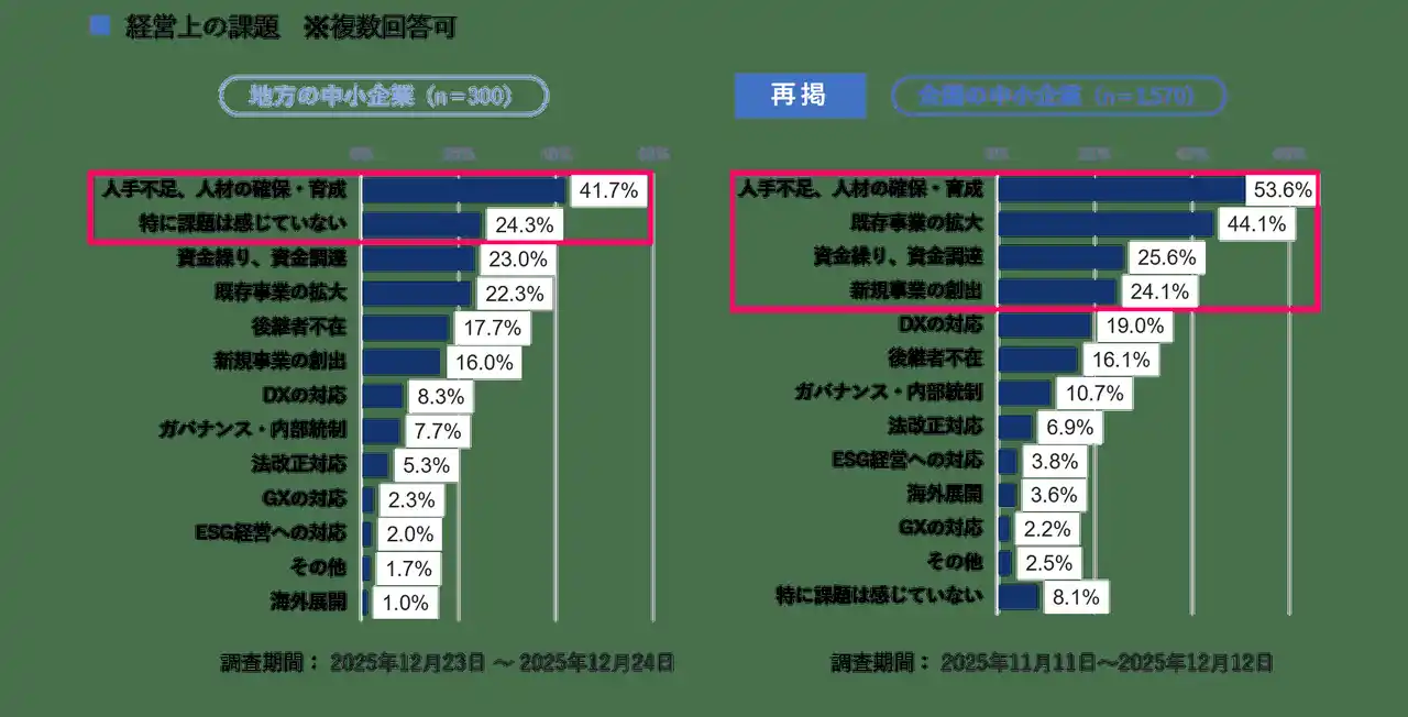 そこで、全国の中小企業経営者を対象に実施した調査結果と同様の調査設問を、東京および政令指定都市を除く地域に所在する中小企業の経営者を対象に新たに実施した調査結果の比較分析を試みました。なお、本レポートでは前者を「全国の中小企業」、後者を「地方の中小企業」と表記することにします。本リリースでは、その調査結果を報告します。 |