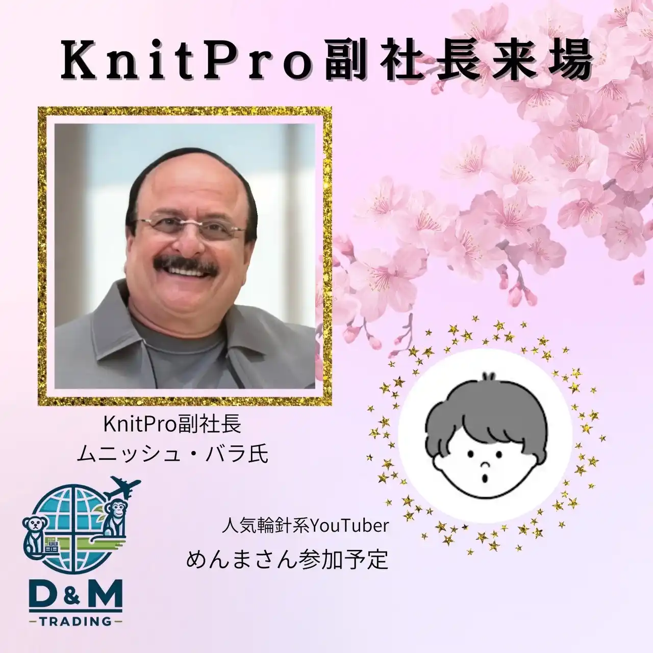 特別ゲストとして、KnitPro社副社長 ムニッシュ・バラ(Munish Bhalla)氏、ならびに人気輪針系YouTuber めんまさん(@menma_______) の来場を予定しております。 |
