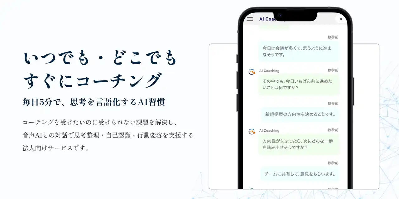 今すぐ自分の考えを整理し、目的や目標を言語化できる、法人向けにAIでコーチングを受けられる、毎日5分の新習慣です。音声AIとの対話を通じて、クイックに思考を整理し、自己認識を高め、行動変容へとつなげます。 |