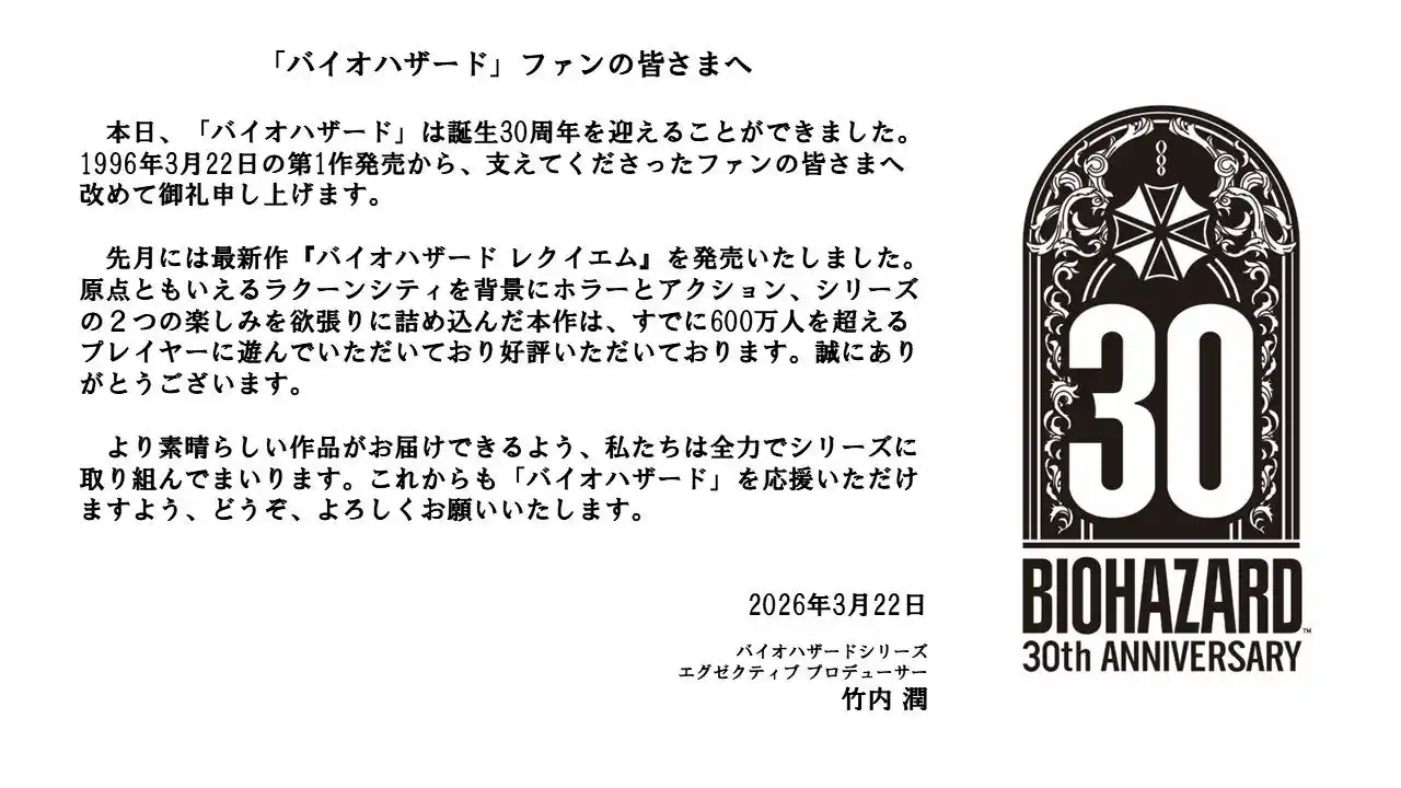 2026年3月22日(日)に、バイオハザードシリーズは第1作の発売から30周年を迎えることができました。ご支援いただきましたすべてのゲームファンの皆さまへ向けて、バイオハザードシリーズのエグゼクティブプロデューサーを務める竹内 潤より御礼のメッセージを公開しております。 |