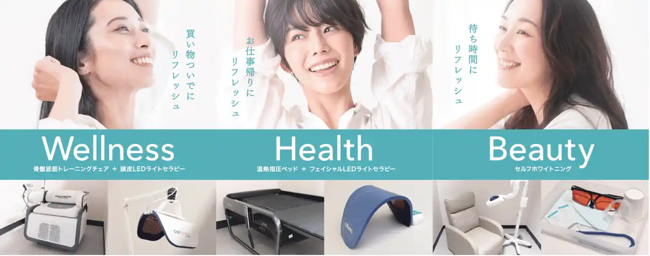 プロ仕様のセルフケア:骨盤底筋トレーニングチェア、セルフホワイトニング、温熱指圧ベッドなど、家庭では実現できない本格的な体験と実感できる効果を提供。 |