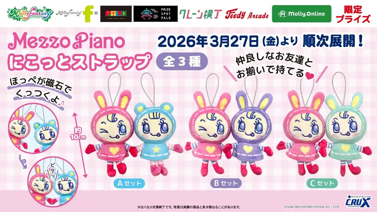 株式会社イオンファンタジー(本社:千葉県千葉市、代表取締役社長:藤原徳也、以下、当社)は、株式会社ナルミヤ・インターナショナル(本社:東京都港区、代表取締役執行役員:保坂大輔)が展開する、オリジナルブランド「mezzo piano junior(メゾピアノ ジュニア)」オリジナルキャラクター「ベリエちゃん」のプライズゲーム用景品「メゾピアノ にこっとストラップ」を、「モーリーファンタジー」「PALO」をはじめとするアミューズメント施設、オンラインクレーンゲーム「モーリーオンライン」にて3月27日(金)より順次展開いたします。 |