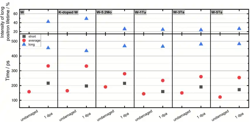 図1 非照射(undamaged)及び鉄イオン照射後(1 dpa)のW、W-1,3,5Ta、W-5.2Mo、K-doped Wにおける陽電子平均寿命 |