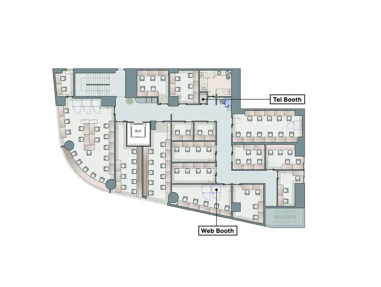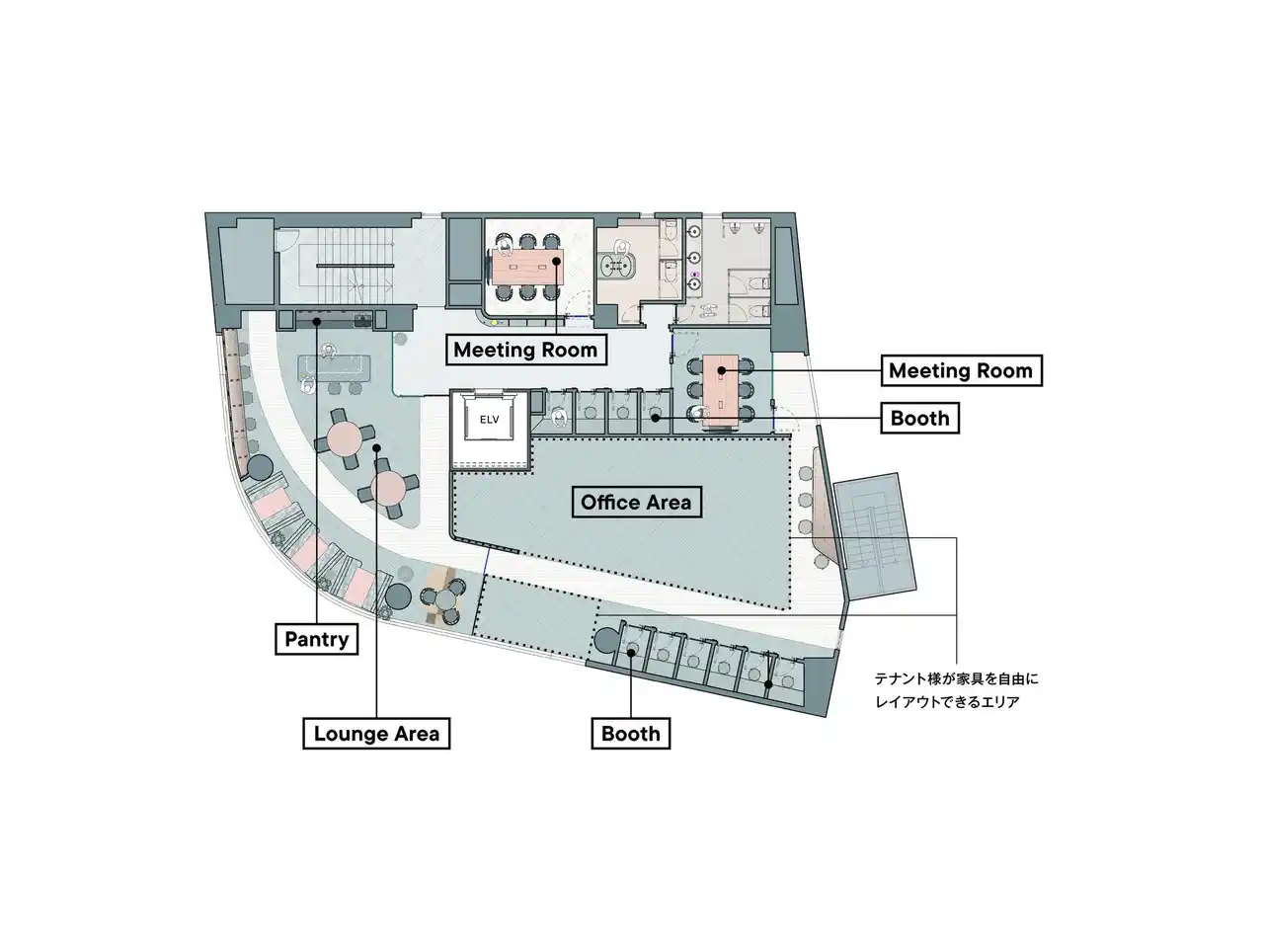 専用会議室や多数のWEBブース、専用パントリー等を備えた、フロアセキュリティ完備の1フロア1テナント専用オフィスプラン。セットアップ済みの専用ラウンジを備え、オフィスエリアについては自由にレイアウトが可能です。 |