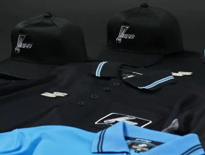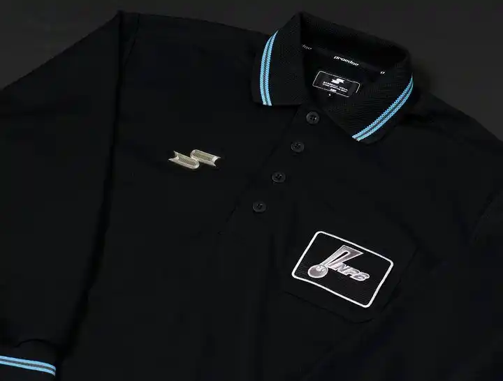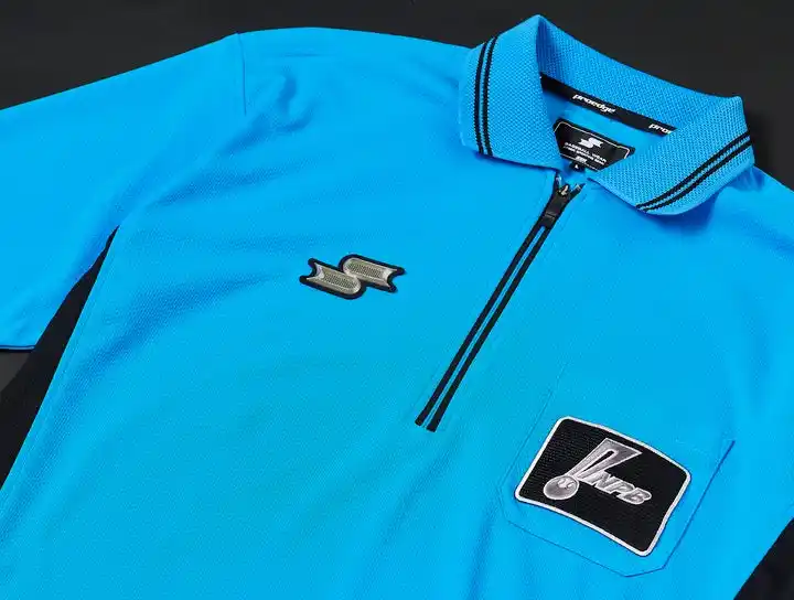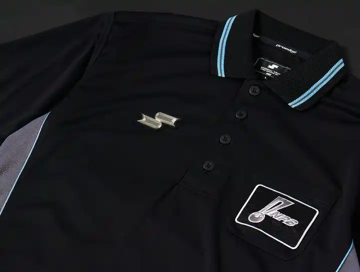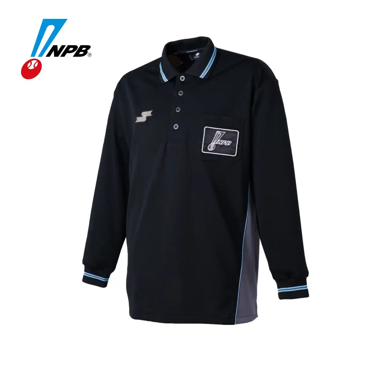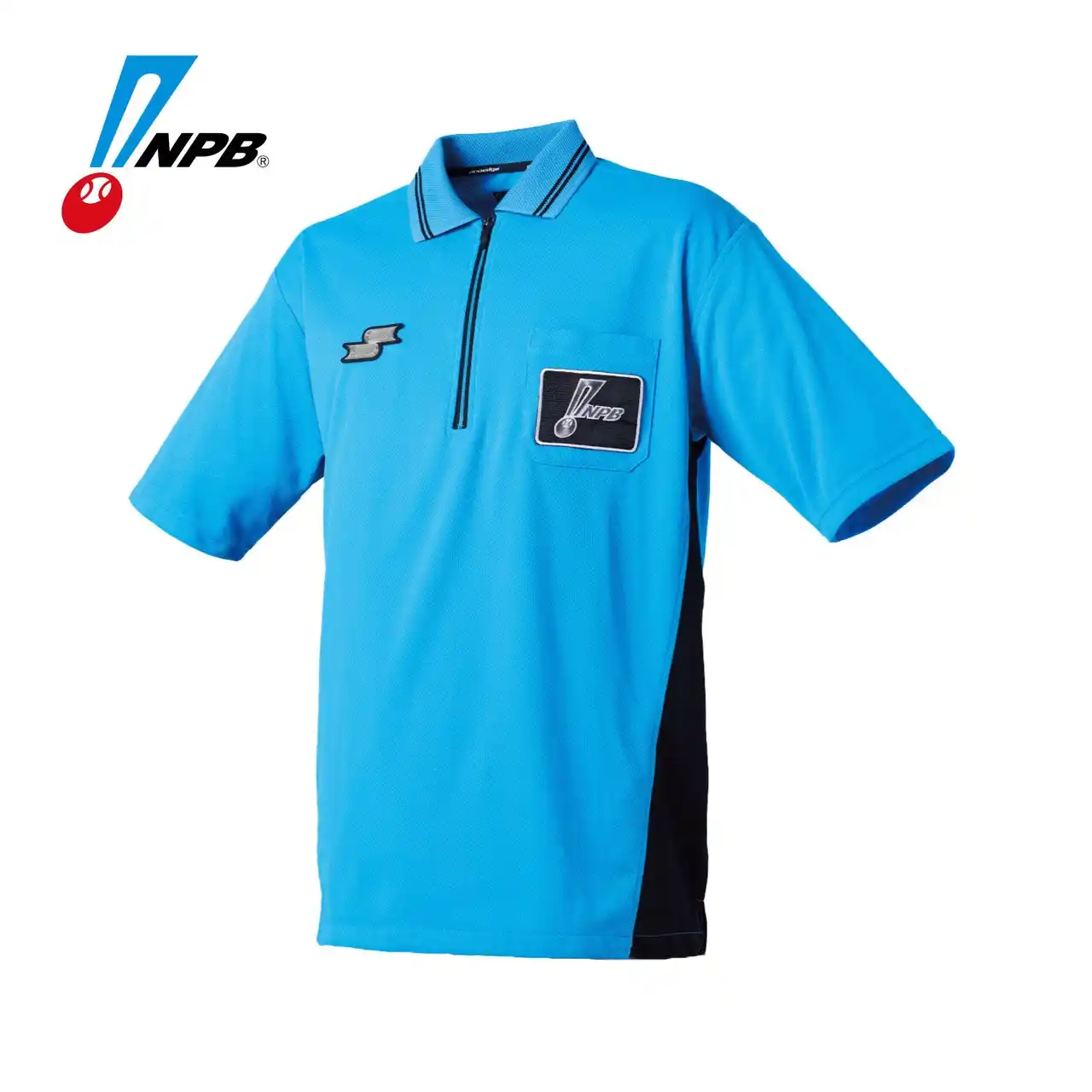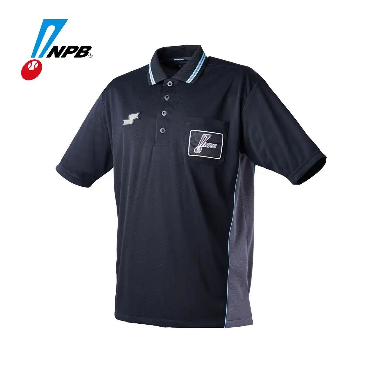 胸と後襟下に刺繡ワッペンのNPBマークを配置したオフィシャル審判シャツ。 |