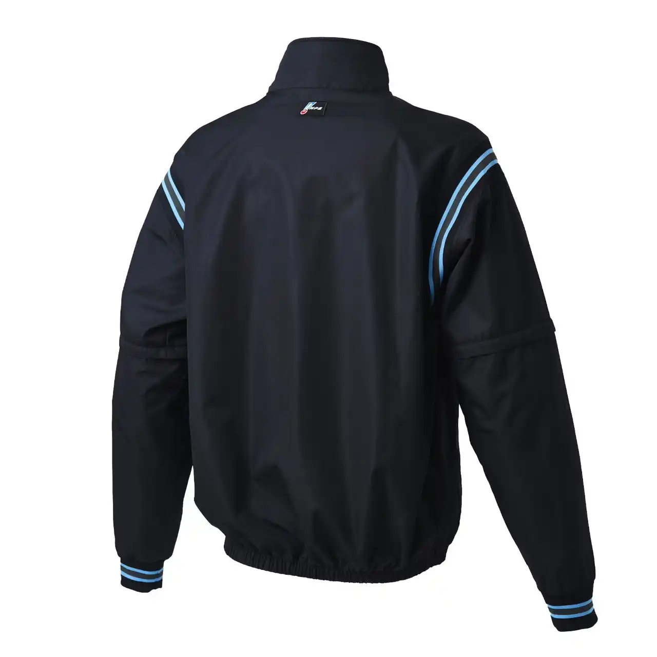 胸元と後襟下に刺繍ワッペンのNPBマークを配置したオフィシャル審判ジャケット。デザインはマットなブラックを基調に、鮮やかなNPブルーのラインをアクセントとして配置。素材は、防風性に加え、軽量性と撥水性に優れた高機能ポリエステルを採用し、球審時にも着用可能なインサイドプロテクター対応。袖は内側のジップで簡単に着脱でき、春先や初夏の暖かい時期には袖を取り外し、半袖として着用可能な2WAY仕様。 |