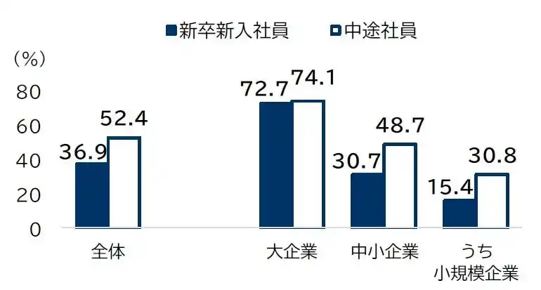 規模別にみると、「大企業」では「新卒新入社員」が72.7%、「中途社員」が74.1%だった。他方、「中小企業」では「新卒新入社員」が30.7%だったのに対し、「中途社員」は20ポイント近く高い48.7%となり、大企業に比べて中途採用をより重視する傾向がうかがえる。 |
