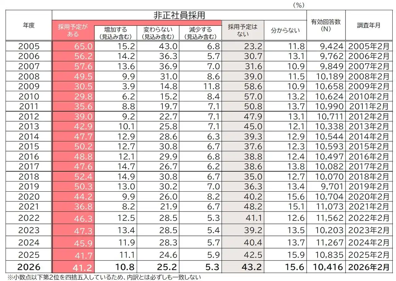 2026年度の非正社員の採用状況について尋ねたところ、『採用予定がある』(「増加する」「変わらない」「減少する」の合計)企業の割合は前年度比0.5ポイント減の41.2%と3年連続で低下した。 |