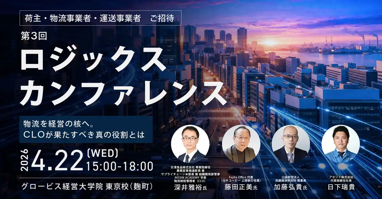 物流DXを推進するアセンド株式会社(本社:東京都新宿区、代表取締役:日下瑞貴、以下「当社」)は、この度、3回目となる大型イベント「ロジックス カンファレンス ~物流を経営の核へ。CLOが果たすべき真の役割とは~」を、2026年4月22日(水)に開催いたします。 |