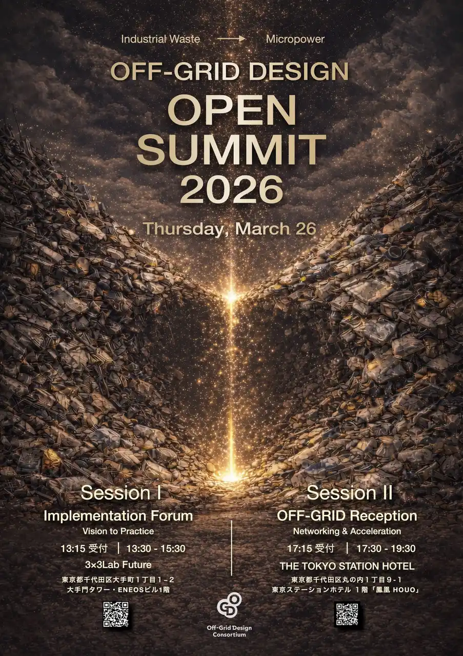 一般社団法人オフグリッド・デザインコンソーシアム(所在地:東京都千代田区、代表理事:中川聰、以下OGD)は、2026年3月26日(木)、東京にて「OFF-GRID DESIGN OPEN SUMMIT 2026」を開催いたします。本サミットでは、暮らしの中の食品残渣から社会的問題となっている産業廃棄物まで、様々な素材を活用して微小な電力を取り出す独自技術「超小集電(Micropower Collection : MPC)」を軸に地域の分散型自立を支援し、オフグリッド社会の実現に向けたビジョンやテクノロジーを発表します。従来のインフラのあり方を問い直し、"Industrial Waste → Micropower"という新たな再生循環型の価値転換を社会に提案する場となります。 |