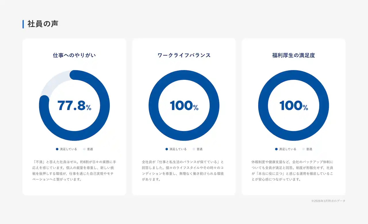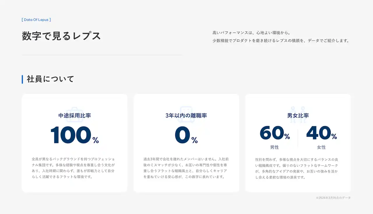 今回のリニューアルでは、求職者が最も気になる「組織の実態」を透明性高く公開いたしました。(2026年3月時点の情報) |