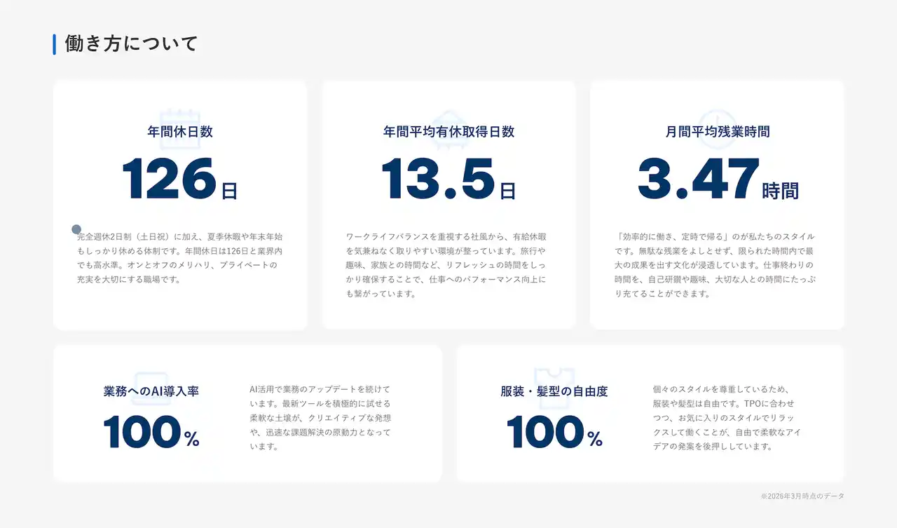 今回公開した『残業3.47時間』や『AI導入率100%』といった数字は、私たちが10年かけて積み上げてきた、プロフェッショナルとしての自律と、互いへの信頼の証です。 |