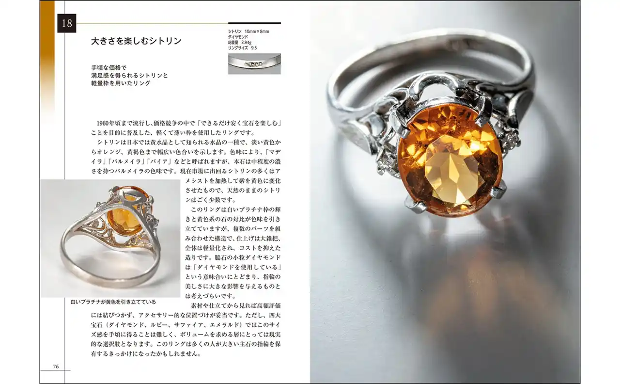 指輪の写真は全てカメラマンの中村淳氏による撮り下ろしです。美麗なメインビジュアルを紙面いっぱいに掲載するとともに、指輪の仕立てがわかりやすいよう、裏側の写真も見せています。 原稿を執筆したのは、監修者が主催している「宝石を手に取る会」の参加者25名で、宝石の専門家から宝石学の入門者まで様々です。専門的な知識のほか、指輪から受けた印象・感想といった一般的な視点もあり、学びと共感がともに得られる内容です。 |