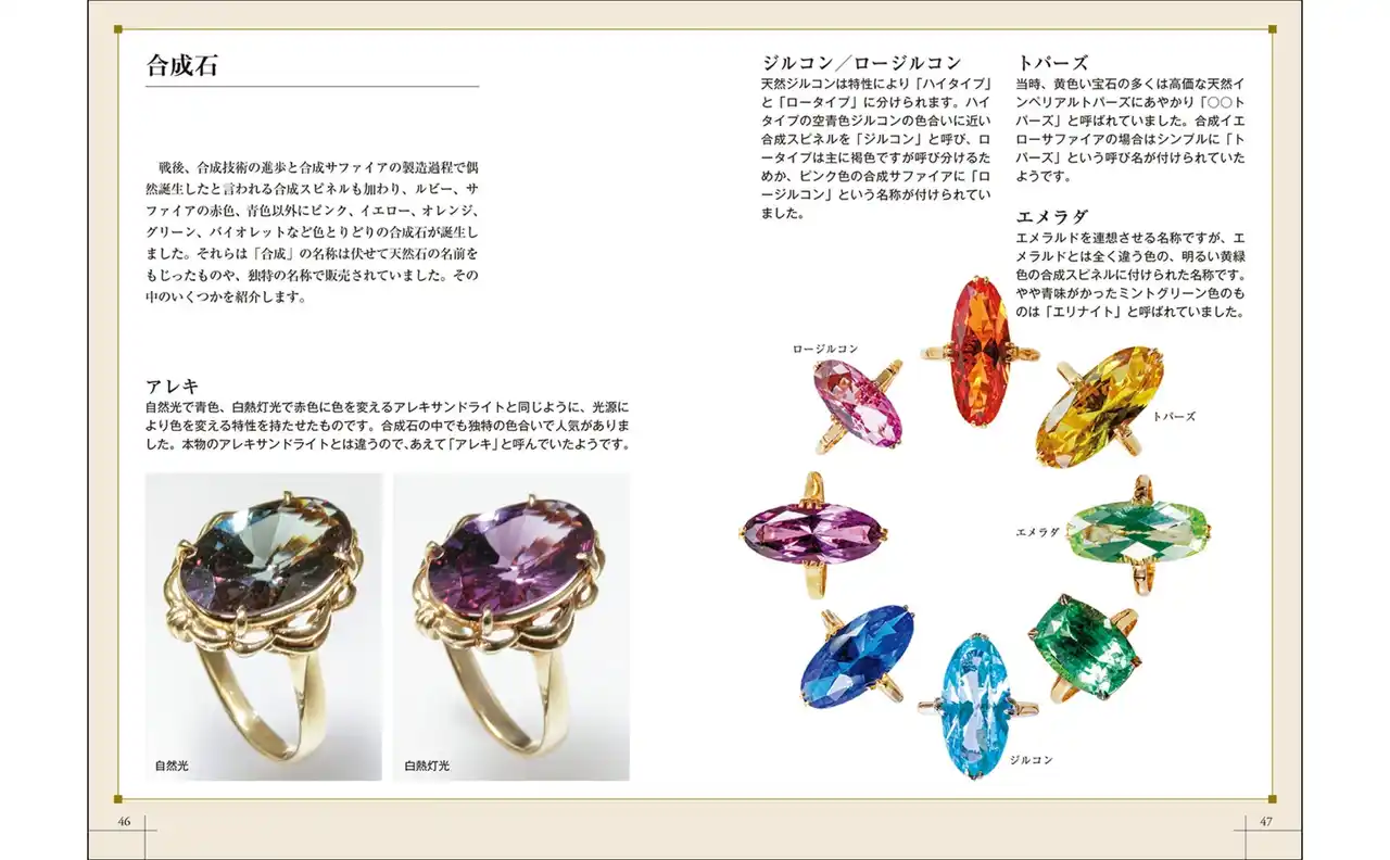 また本書では、合成石とはどういったものなのか、模造石の見分け方や貼り合わせ石の構造など、これまであまり語られることのなかった人工生産物についてのコラムも掲載しています。65年前のゴム型を用いて日本の伝統技巧「千本透かし」を再現するなど、歴史的に貴重な資料の掲載もあり、コラムの枠に収まりきらないほどの充実した内容となっています。 |