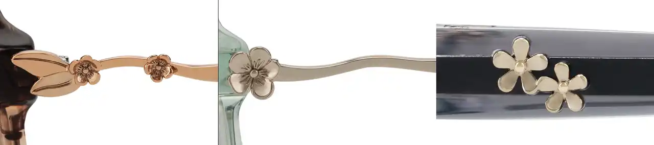 サイドにあしらった立体的なお花のメタルパーツが、目元に華やかさを添える高級感のあるシリーズ。肌なじみの良い、やさしい色合いのアセテート生地を使用することで、顔色をワントーン明るく見せてくれます。調整可能な鼻パッドと、広めに設計されたフレームの上下幅により、遠近両用などの累進レンズや、初めてのリーディンググラスとしてもおすすめです。 |