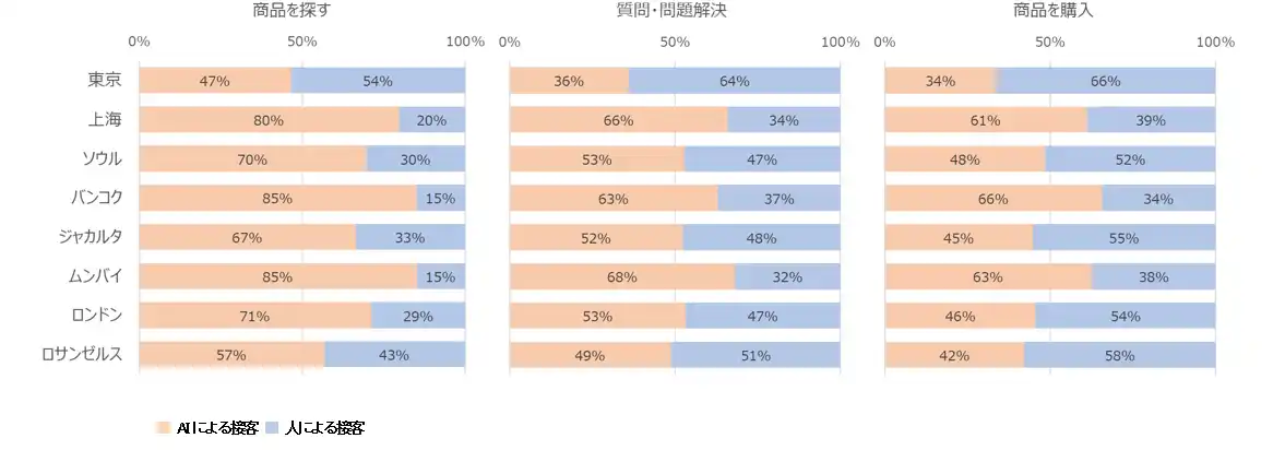 ●都市別にみると、実際の利用率や利用意向を反映して、ムンバイ、バンコク、上海ではいずれの段階でもAIに任せたいという回答が相対的に多い。「商品を探す」段階ではムンバイとバンコクが85%、上海が80%と高く、東京は47%にとどまっている。「商品を購入」でも、上海やバンコク、ムンバイでは「AI接客」への好みが「人による接客」を大きく上回った。 |