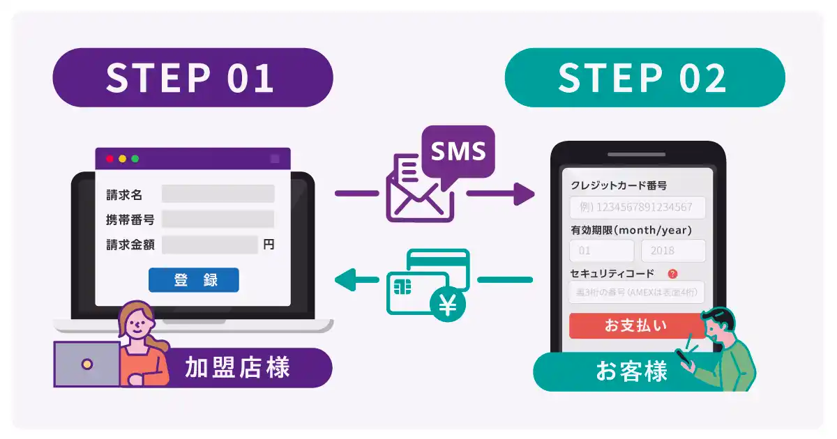 決済システム上で請求情報を作成後、ワンクリックでSMS送信が可能。電話対応中のリアルタイム送付にも対応します。 |
