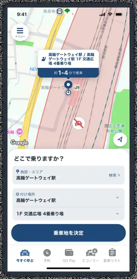 高輪ゲートウェイ駅でのアプリご注文時は、駅直結のTAKANAWA GATEWAY CITY交通広場1階の4番のりばが乗車地として自動設定されます。物理的なのりばがあることによって待ち合わせが容易になるほか、乗車から決済までアプリ内で完結できるため、アプリをご利用されるお客様の利便性向上はもちろんのこと、乗務員の皆様にとっても接客対応の負担軽減につながります。駅をご利用される国内、およびインバウンドのお客様にスムーズなタクシー乗車体験を提供し、ビジネスや観光などあらゆる移動の利便性向上に貢献してまいります。 |