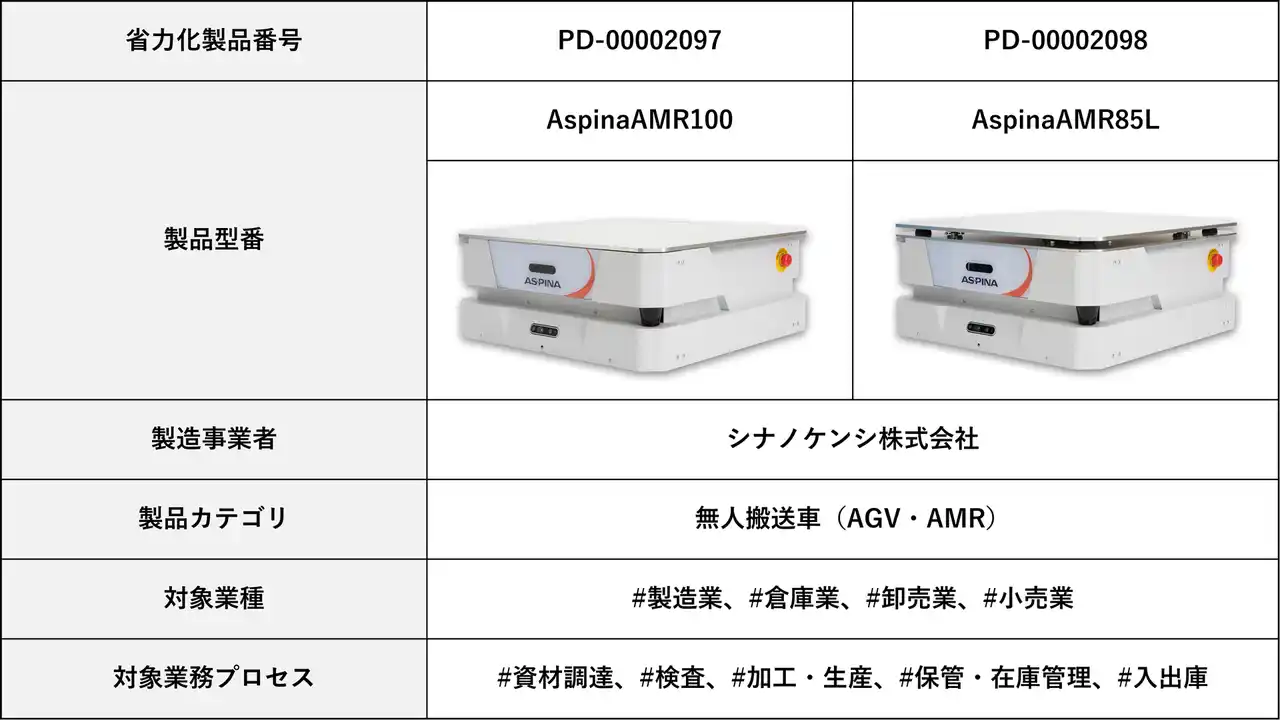 ASPINA(シナノケンシ株式会社、本社:長野県上田市、代表取締役社長:金子 行宏、以下「ASPINA」)は、独立行政法人中小企業基盤整備機構による「中小企業省力化投資補助金」のカタログに、製造現場向け自動搬送ロボット『AspinaAMR100』および『AspinaAMR85L』が登録されたことをお知らせします。 |