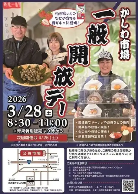 柏市公設市場では、2026年3月28日(土)に一般開放デーを開催します。柏市産いちごなどの農産品が当たる人気企画「農ガチャ」が今回初登場します。 また、青果の特別販売として、じゃがいもや玉ねぎなどの野菜の詰め放題イベントを実施するほか、普段は立ち入ることができない水産棟では、アサリなどの魚介類の販売も予定しており、来場者の皆さまに、旬の食材を選べる機会を提供します。 |