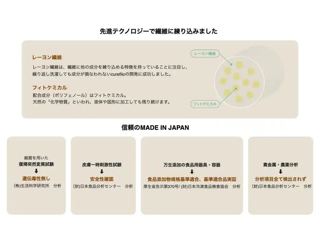 | 本プロジェクトでは、天然植物由来成分を繊維に練り込んだ機能性素材「curefilo(キュアフィーロ)」 を採用しています。 | |||