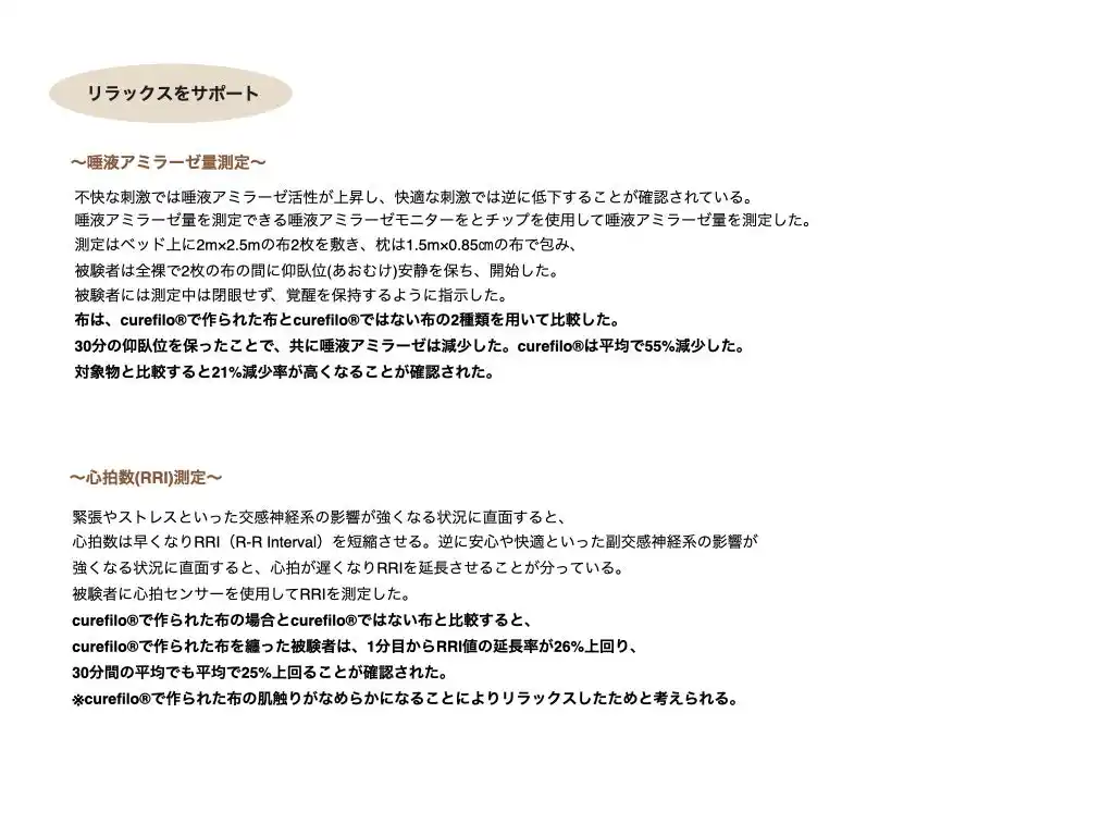 | さらに、素材の検証では、curefiloを使用した布を用いた比較試験において、就寝後の皮膚水分量の増加などが確認されており、乾燥を抑える環境づくりへの寄与が示唆されています。 | |||