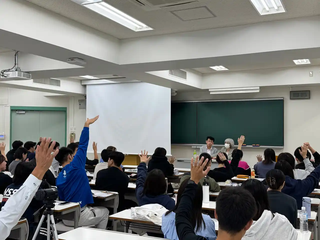 今年度の「盲ろう者理解・啓発プログラム」(授業での盲ろう者の講演)の様子 |