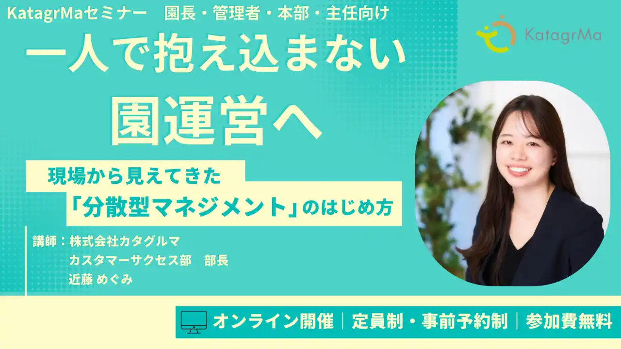 株式会社カタグルマ(本社:東京都千代田区、代表取締役社長/CEO:大嶽 広展)は、2026年3月25日(水)・26日(木)の2日間、園長や施設長が一人で業務を抱え込む体制を脱却し、組織全体で運営を担う「分散型マネジメント」をテーマにした無料ウェビナーを開催いたします。 |