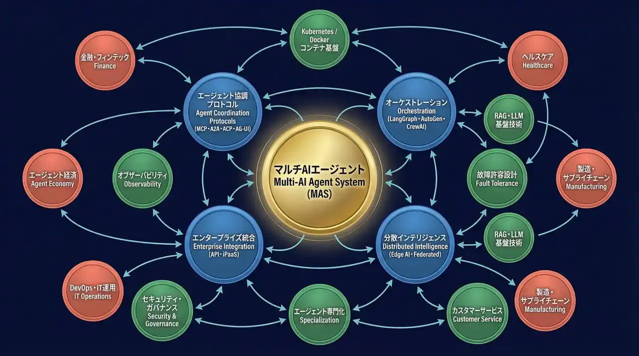 本白書は、マルチAIエージェントの概念・分類から、実装モデル、プラットフォーム技術、エンタープライズ向けフレームワーク、そしてセキュリティ・ガバナンスに至る全領域を、850ページにわたって体系的に網羅した白書である。MCP・A2A・ACPという4大プロトコルの標準化、LangGraph・CrewAI・AutoGenの実装比較、Kubernetes上でのコンテナ化エージェントから故障許容設計・LLMOps監視、さらに階層型・分散型・サーバーレス型の各実装モデルを詳述している。 |