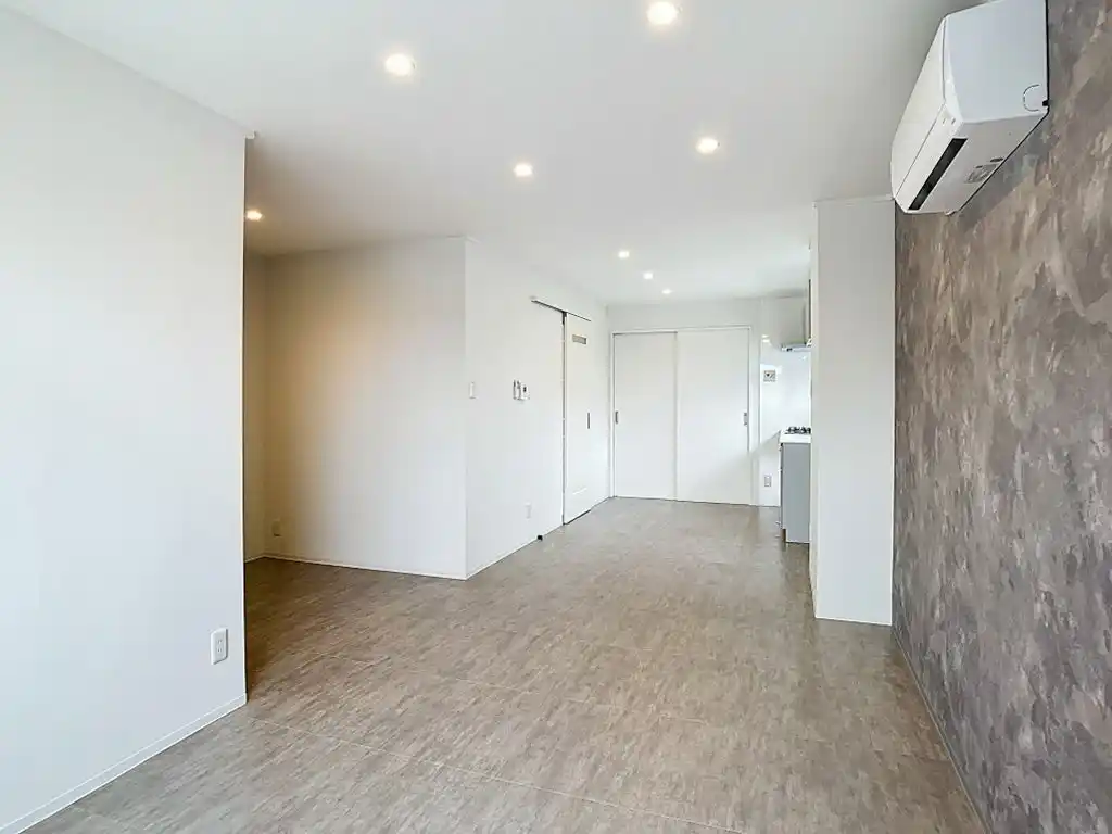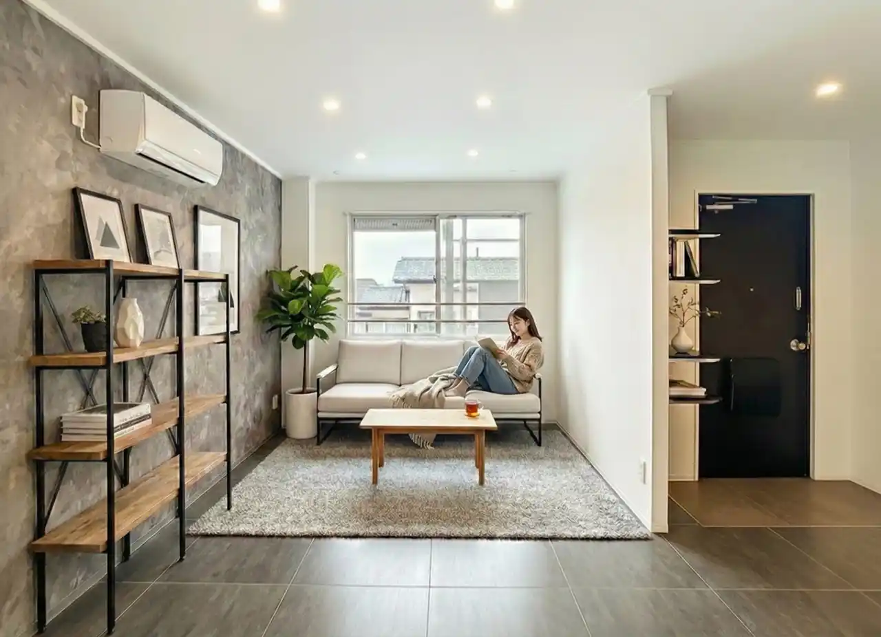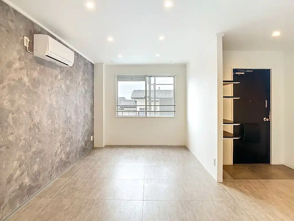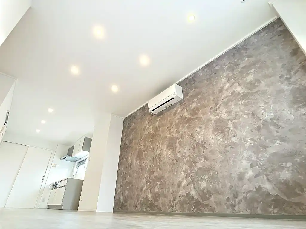 本デザインでは、コンクリート調のアクセントウォールと石目調フロアを採用しています。 無機質で都会的な素材感を取り入れることで、周辺物件との差別化を図ると同時に、住む人の感性や持ち物が映える土台をつくりました。 単なる内装変更ではなく、「自分だけの空間をつくりたい」というニーズに応えるための設計です。 |