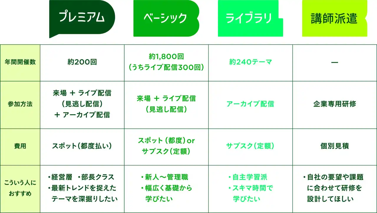「ベーシック」では、来場型の対面研修をサブスクリプション形式で利用できるサービスを提供しています。企業が年間を通じて計画的に人材育成を進められる仕組みであり、約1,500回の対面研修と300回のライブ配信を定額制で受講できるサービスとして、国内屈指の規模となります。 |