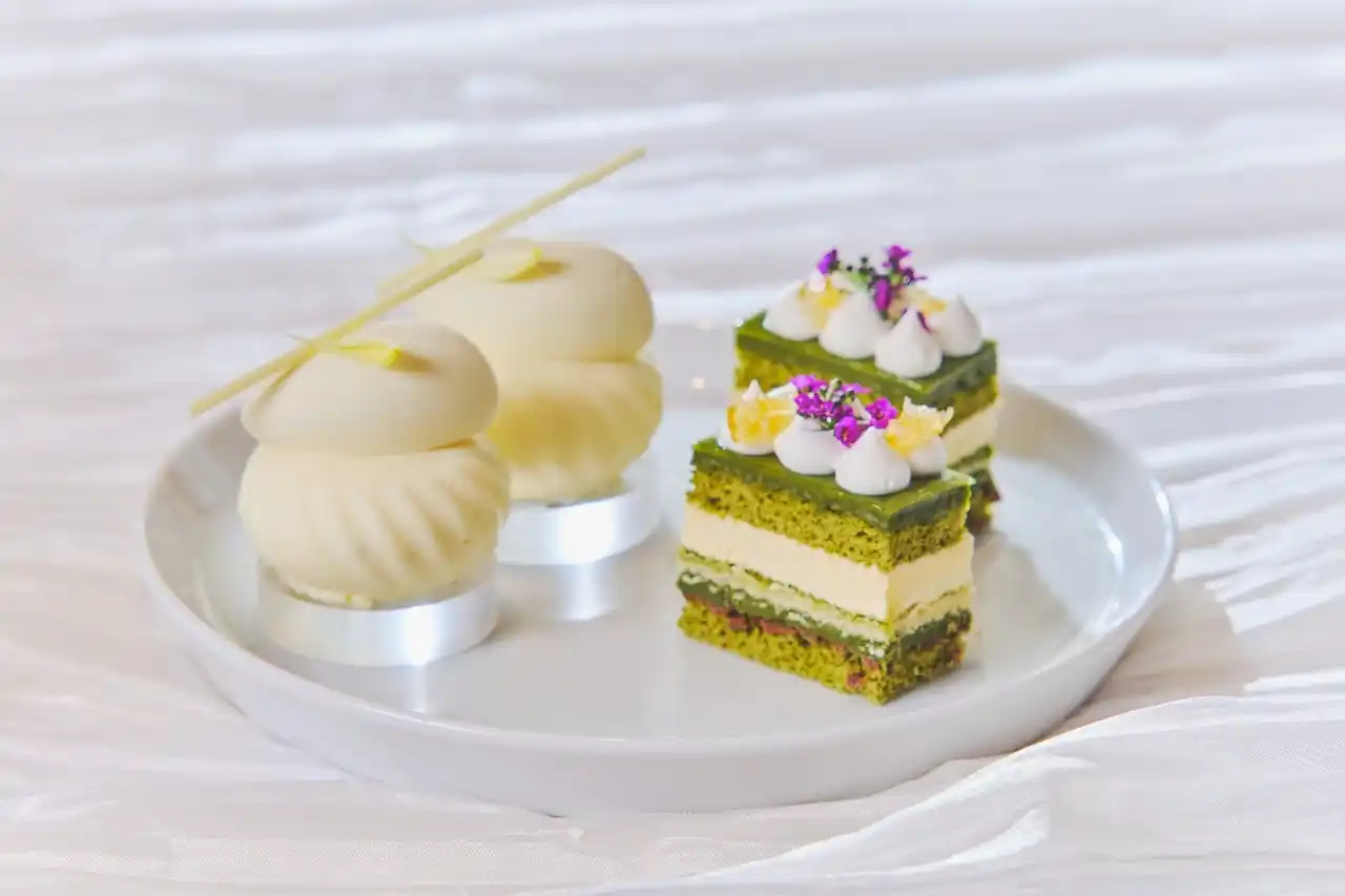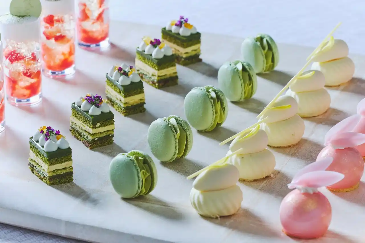 いちごのソースにいちごとシャンパンのジュレを重ね抹茶が香るフォームで仕上げたヴェリーヌ、抹茶のクリームとフレッシュいちごで仕上げた色彩豊かなタルト、さっぱりとしたライムのジュレを忍ばせたいちごのムース、抹茶のガナッシュとミルクチョコレートの層が美しいオペラ、抹茶のジュレと爽やかな柑橘香るホワイトチョコのムース、抹茶のマカロンなどいちごと抹茶のハーモニーを楽しめるスイーツ6種をご用意。 |