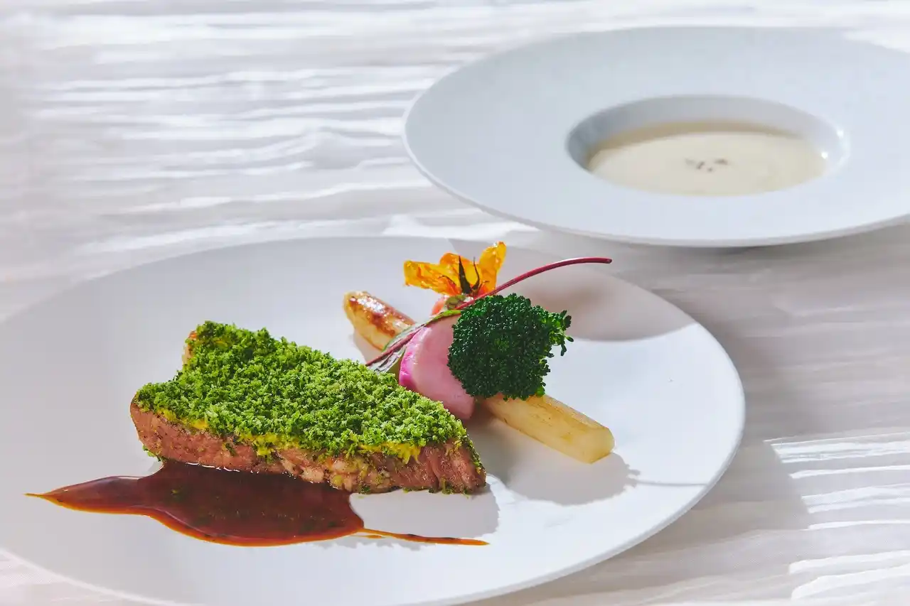 豚肩ロースの香草パン粉焼き ハーブとマスタードのソース/サルシフィーのポタージュ 1,500円 |