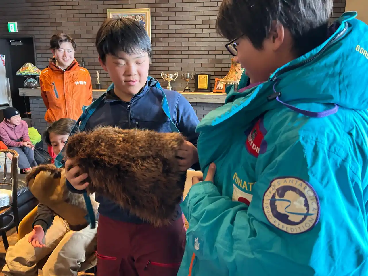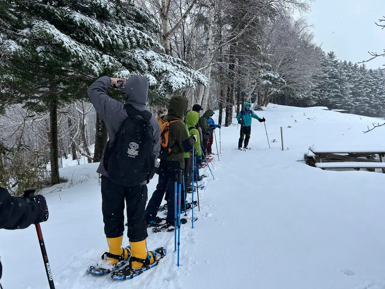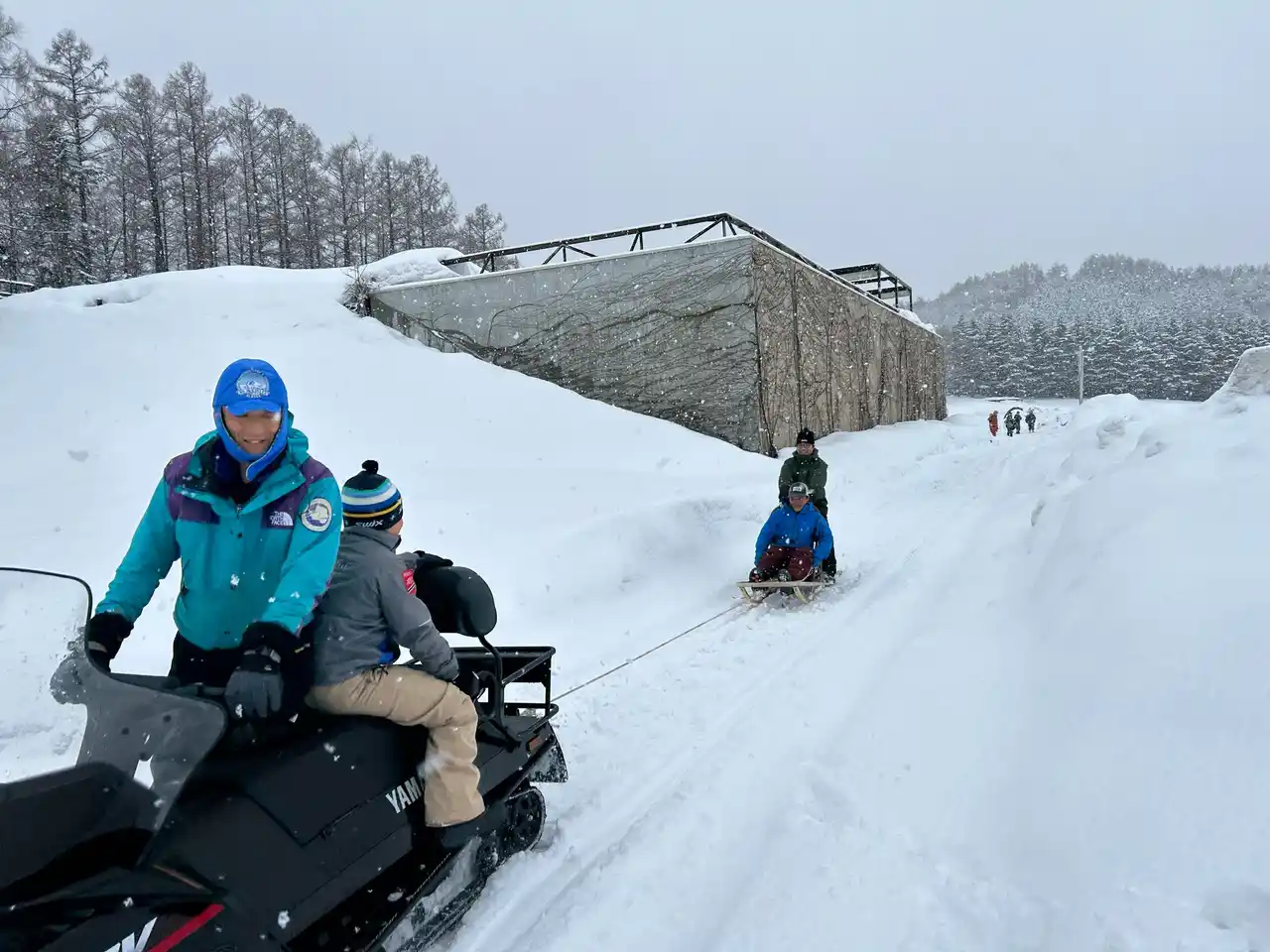 | 当日は強風雪のため、安全を最優先とし、朝7:00の時点で赤井川村やガイドと協議の上、赤井川村での稜線ハイクから同じ余市郡内にある仁木町のNIKI Hills Wineryでのプログラム開催となりました。参加者たちはスノーシューを履いての施設周辺散策や、斜面での尻滑り遊びを満喫しました。また、スノーモービルを活用した犬ぞり(アイアンドッグ)体験や、今回ガイドを務めた世界的冒険家・舟津圭三氏による室内での「冒険教室」を実施し、変化に富んだプログラムを提供しました。 | ||||||||||||||