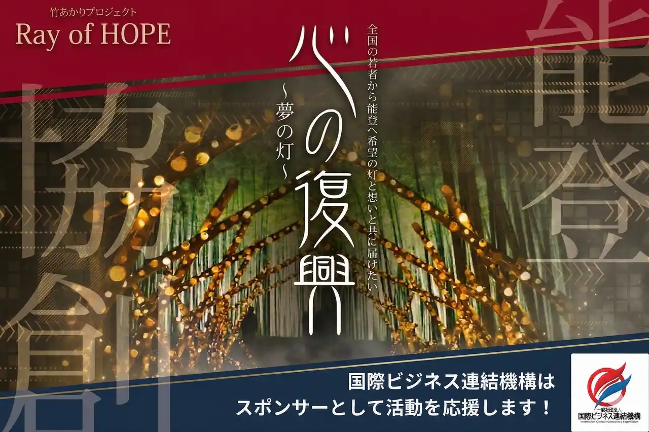 | 日本企業の海外進出を「知識・人脈・きっかけ」の3軸で支援する一般社団法人 国際ビジネス連結機構(所在地:東京都港区、代表理事:松浦啓介)は、一般社団法人Super Giversが主催する「Ray of HOPE 心の復興 ~夢の灯~ 竹あかりプロジェクト」にスポンサーとして参画したことをお知らせいたします。本取り組みを通じ、震災復興支援と次世代人材・企業の共創機会創出を推進してまいります。 | |||