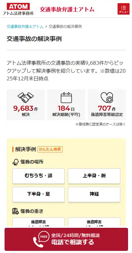 アトム法律グループ(所在地:東京都千代田区、代表:岡野武志)は、交通事故に特化した専門メディア『交通事故弁護士アトム』内の「解決事例データベース」ページを大幅にリニューアルいたしました。(URL:https://atomfirm.com/media/jisseki ) |