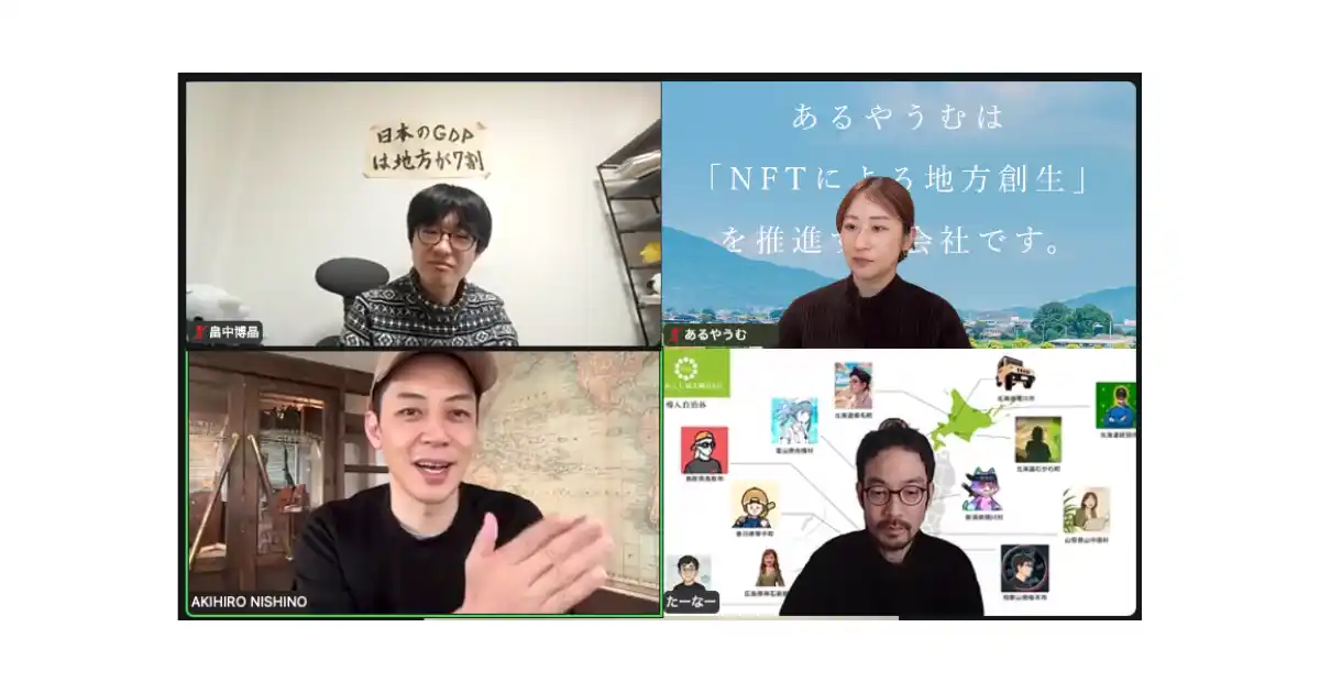 株式会社あるやうむ(本社:北海道札幌市、代表取締役:畠中 博晶)は、1月より西野亮廣氏が企業の顧問となるサービス「西野顧問」を導入し月に一度のコンサル支援を通じて、当社が推進する「地域おこし協力隊DAO」事業を中心に、地域コミュニティ構築および隊員の活動支援に関する議論を進めていることをお知らせします。 |