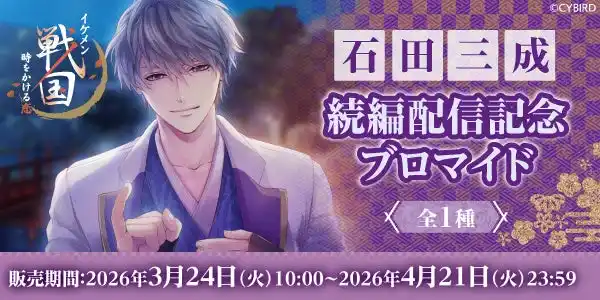 株式会社サイバード(本社:東京都品川区、代表取締役社長 兼 CEO 長嶋 貴之)が手掛ける、全世界でのシリーズ累計会員数4,500万人を誇る大人気恋愛ゲーム「イケメンシリーズ」の最新作『イケメン戦国 時をかける恋 -永縁-(読み:えいえん)』(以下、『イケメン戦国 -永縁-』)は、「石田三成(CV:山谷 祥生)」(以下、「石田三成」)の続編ストーリーを2026年3月23日(月)12時より、配信を開始しました。 |