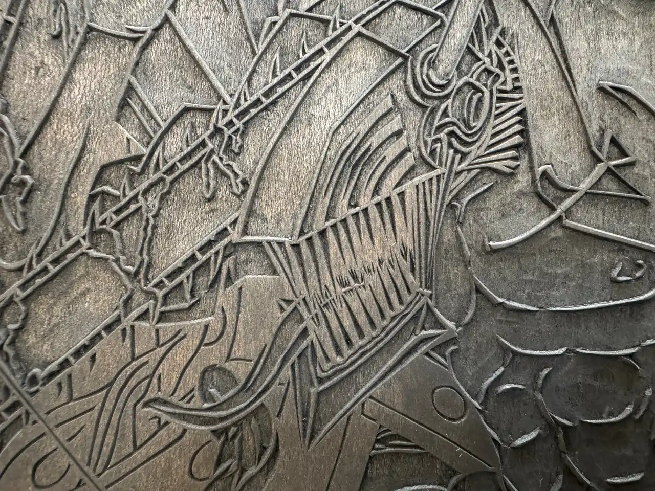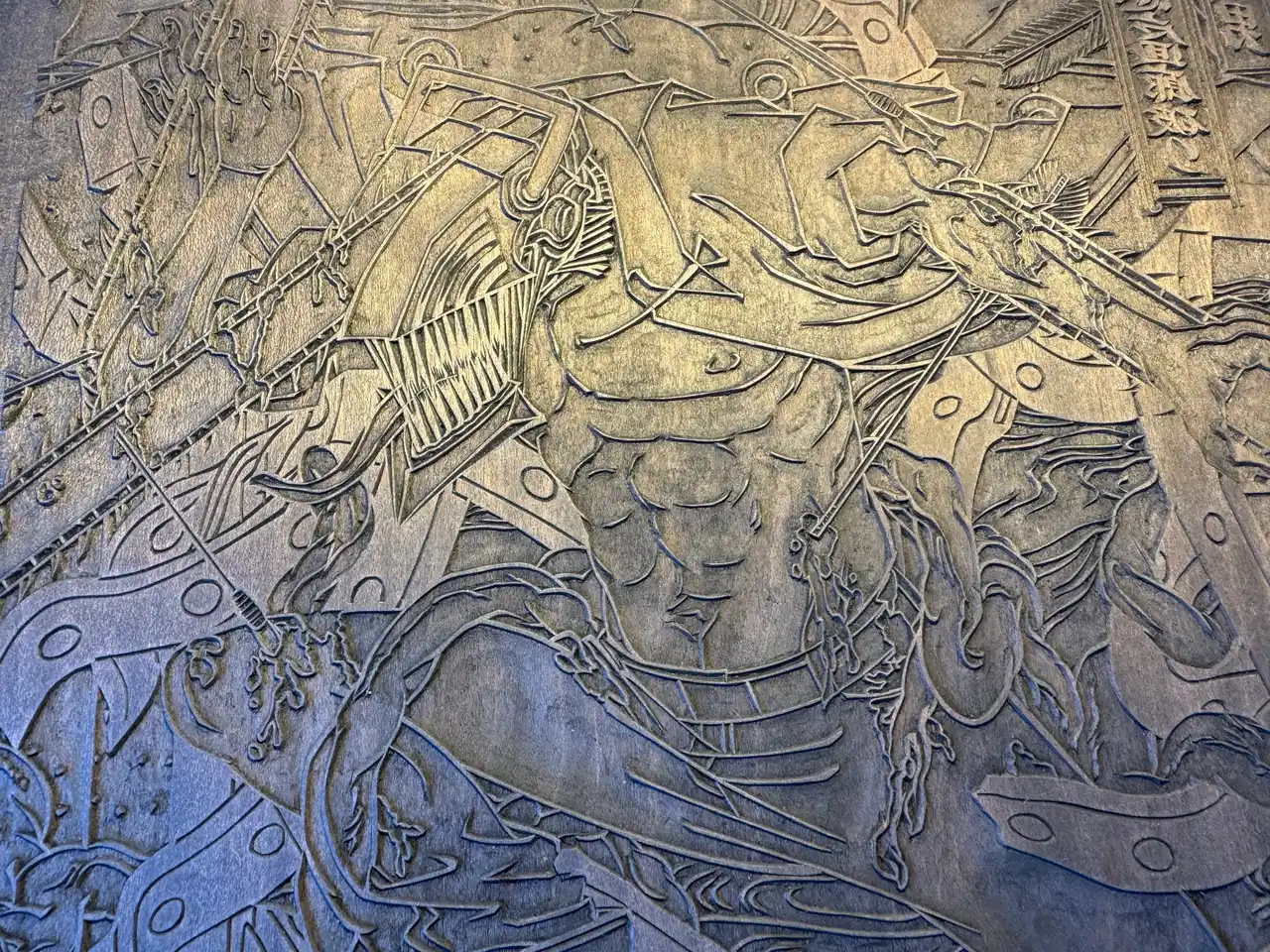 繊細に彫り分けられた版木、熟練の職人による幾度にも及ぶ手摺り。伝統的な顔料が生み出す深みある色彩と、血潮や刃の軌跡を想起させる大胆なビジュアル。その緊張感あふれるコントラストを、ぜひ間近でご鑑賞ください。 |