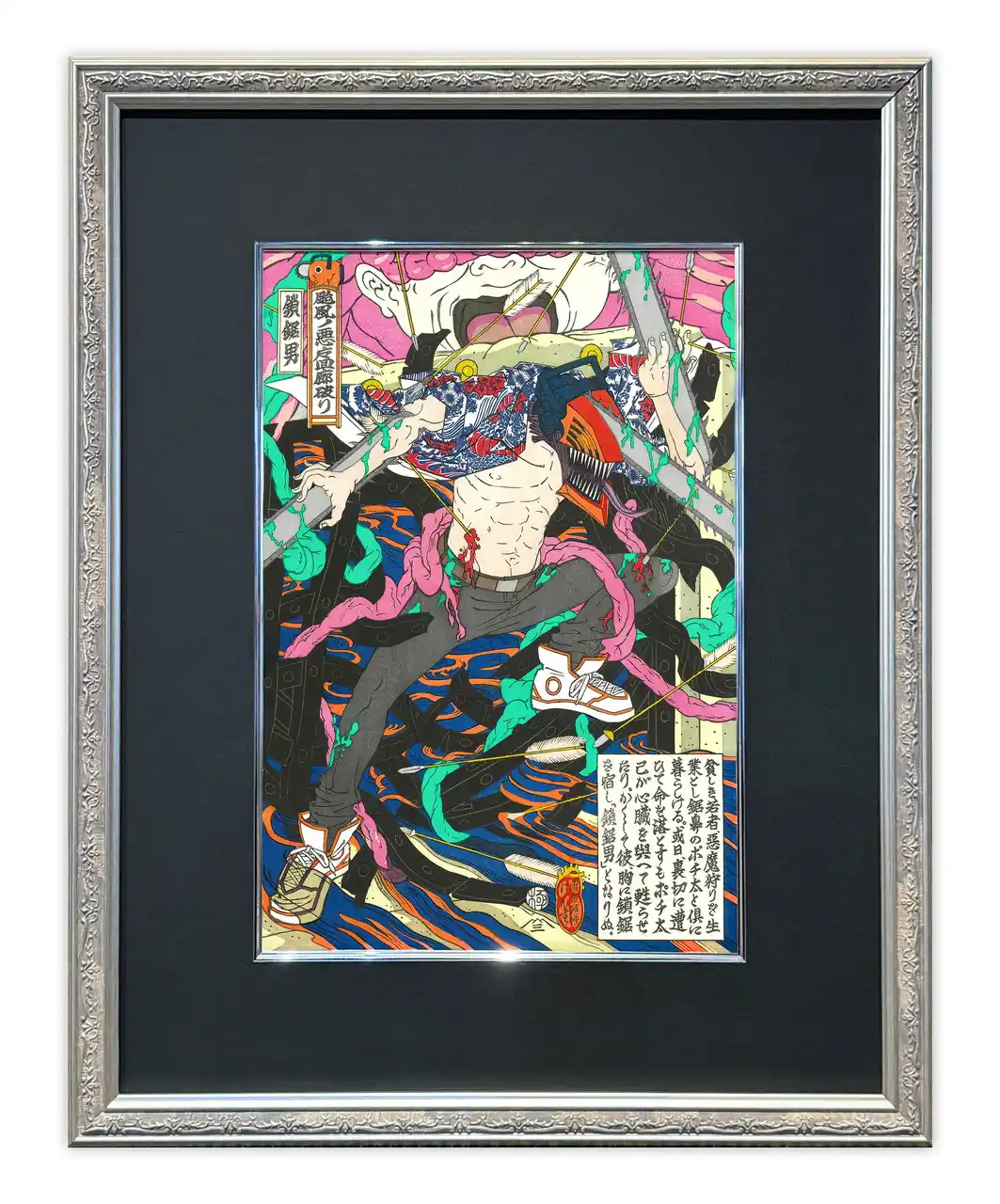 本企画は、江戸後期の鬼才浮世絵師・歌川国芳による代表作「通俗水滸伝豪傑百八人之一個 浪裡白跳張順」をベースに、『チェンソーマン』の世界観を融合させた浮世絵木版画作品です。 |